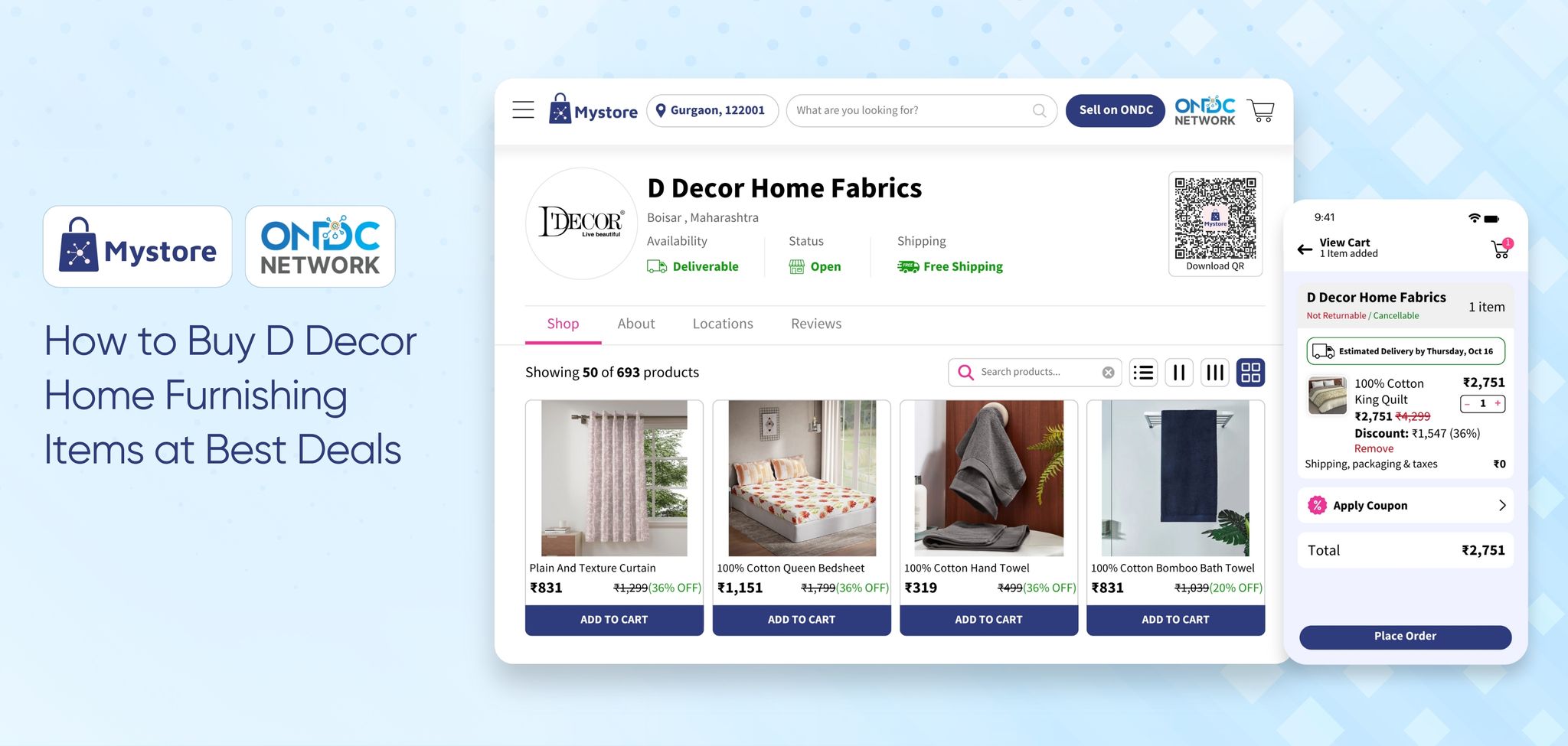 MystoreMystore® is an ONDC connected marketplace built in India for Indian sellers. Mystore is the first ONDC network participant to connect as a Buyer and Seller NP.  You can register as a seller on Mystore and upload your catalogue. You will have a dedicated Seller page (digi-catalog) along with a Unique QR Code for your page that you can market to your buyers. Your catalogue will also appear on the ONDC network through the Mystore Buyer App and other buyer apps catering to related product domains. Mystore provides a comprehensive seller dashboard to manage your products, orders, and payouts. Mystore also facilitates seamless online shopping across categories with its Mystore Buyer App.https://www.mystore.in/s/62ea2c599d1398fa16dbae0a/66defda954ce55002beebf8c/mystore-logo-480x480.png