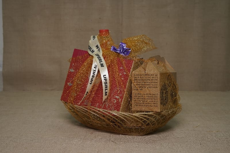 This thoughtfully curated Oval Bamboo Basket combines tradition and artistry, offering a unique collection of millet’s ladoo & biscuits, cow dung moorti, cow dung lamp, ghee pooja batti, tomato ketchup, multipurpose macrame holder, glass candle an...