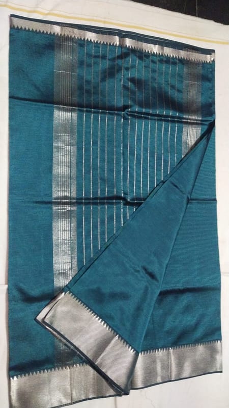 This is a beautiful Kanchipuram silk saree in a deep teal blue color. It features a silver zari border with intricate detailing and a pallu with traditional motifs. The saree is soft and lightweight, making it perfect for any occasion.