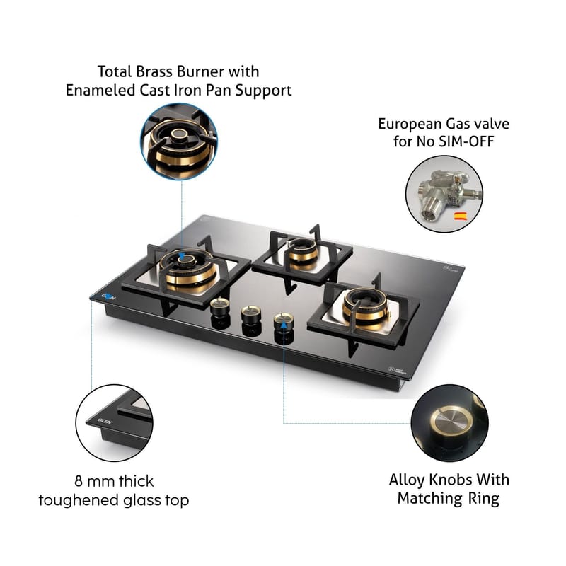 Buy Glen's 3 Burner Extra Large Glass Gas Hob Top with Triple Ring, Total Double Ring Brass Burner with Flame Failure Device. Get sleek designs online at great prices!