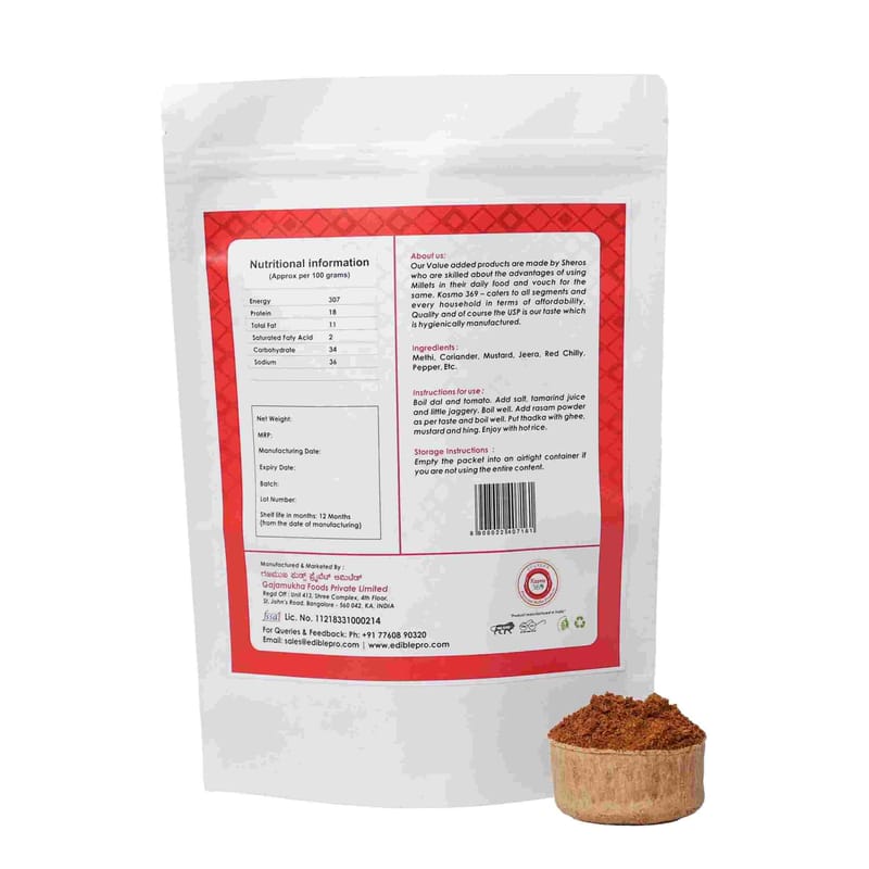 Rasam powder is a versatile and flavorsome spice blend that is an integral part of South Indian cuisine. This ready-to-cook rasam powder with a perfect blend of aromatic spices, this powder imparts an authentic and robust flavour to your rasam. Simply mix the powder with water, adding in tamarind juice, salt & little jaggery, along with boiled dal & tomato and you have a wholesome and comforting bowl of rasam ready to savor in just 10-15 minutes. Rasam is not only delicious but also highly nutritious. Whether you're looking for a quick and easy accompaniment to your rice this pack of rasam powder is a must-have in every Indian kitchen.