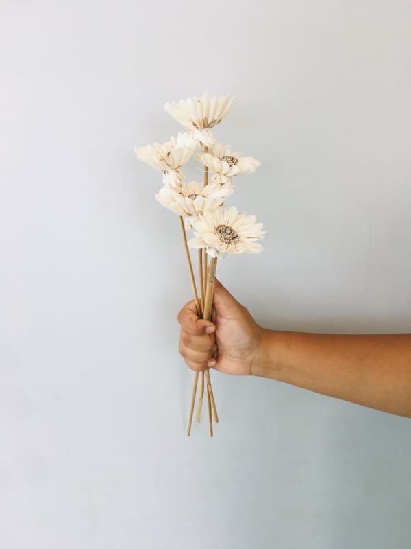 Handmade flowers that are made from tapioca wood peel. It is a softwood. Sola wood- is an entirely natural product derived from the tapioca plant. Make bouquets, table number holders, and decorations. The blossoms measure 2.5" wide and 12" height...