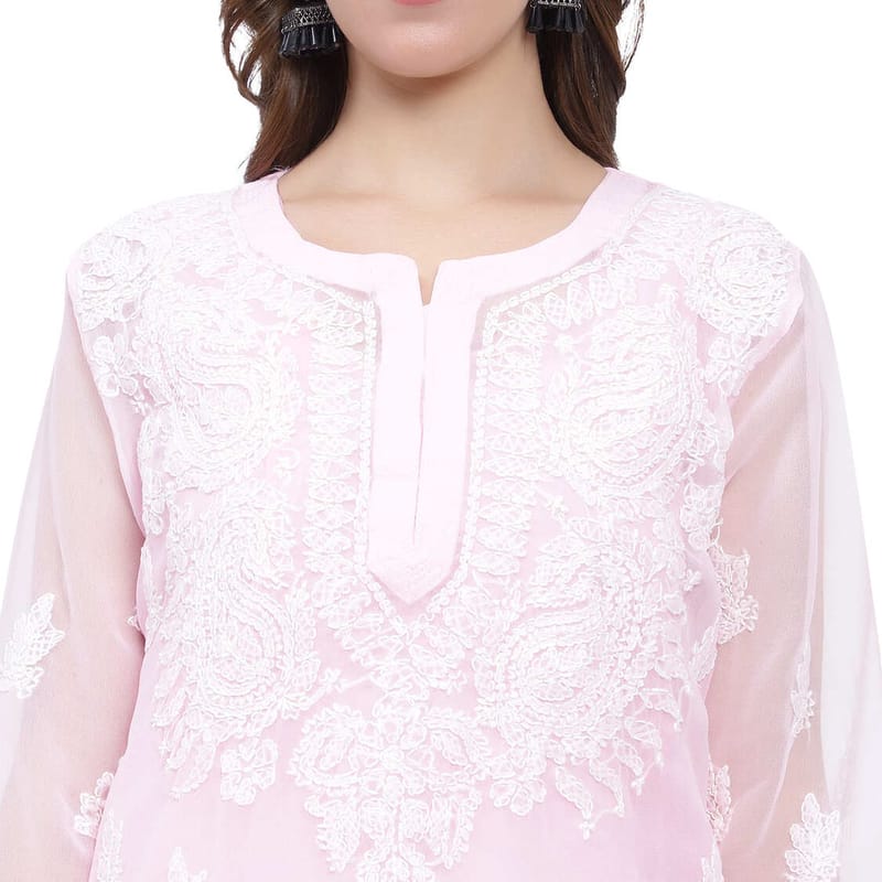 6732fedc631d98942ad1c0c0MRS RIGHT CHIKANKARI PINK GEORGETTE KURTIThe Chikankari embroidered A-line kurta for women, crafted from georgette fabric, is a beautiful blend of traditional craftsmanship and modern style. This kurta features intricate embroidery on the neckline, sleeves, and back, showcasing of fine chikan work. The lightweight and flowy nature of the georgette fabric ensures comfort and elegance, making it an ideal choice for both casual and formal occasions. The detailed embroidery enhances the overall look, making this kurta a stunning addition to any wardrobe. Suitable during summer and spring sessions. Comfortable and ease of movement all of day specially for working women and girls. Kurti if paired with jeans, pant, sharara and palazzo etc. creates a graceful and trendy look for fashionable women and girls.380