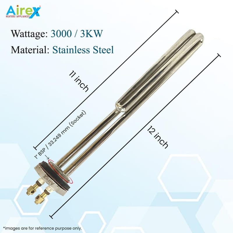 The Airex 3000W All Type Midget Element is designed to provide efficient and fast heating for instant geysers, commonly used in coffee machines, water heaters, and other appliances requiring quick heat generation. Made from high-quality stainless steel, it ensures durability and longevity even under frequent use. The element is built to handle high power with a 3000W capacity and is designed for 230V operation, making it suitable for a wide range of applications.