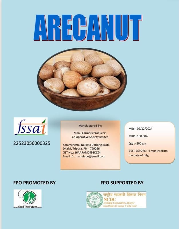 Arecanut, also known as betel nut, is a seed of the Areca catechu palm. It is a popular ingredient in many South Asian and Southeast Asian cuisines, and is often used as a mouth freshener. Arecanut is a good source of tannins, alkaloids, and po...