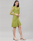 ATTIRIS Women's Lycra Net Solid Bodycon Ruffle Knee Length Full Sleeve Dress with Zipper, Green