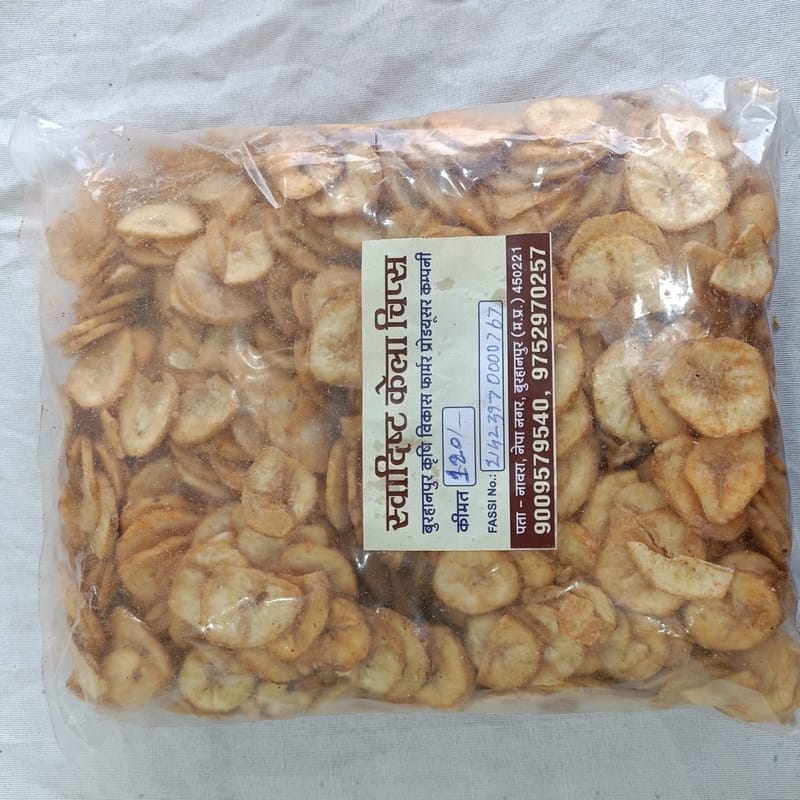 A banana chips is a deep-fried or dried, generally crispy slice of banana prepared by Burhanpur Krushi Vikas Farmer Producer Company Limited.