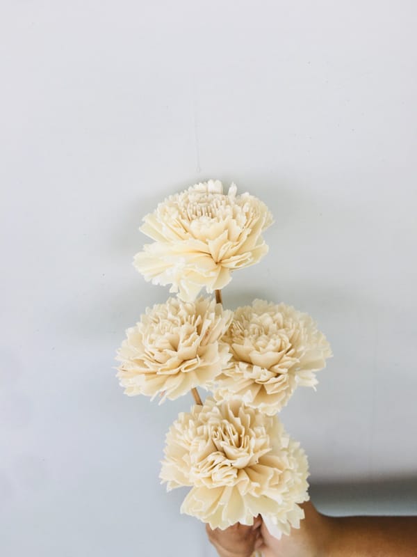 Handmade flowers that are made from tapioca wood peel. It is a softwood. Sola wood- is an entirely natural product derived from the tapioca plant. Make bouquets, table number holders, and decorations. The blossoms measure 2.5" wide and 12" height...