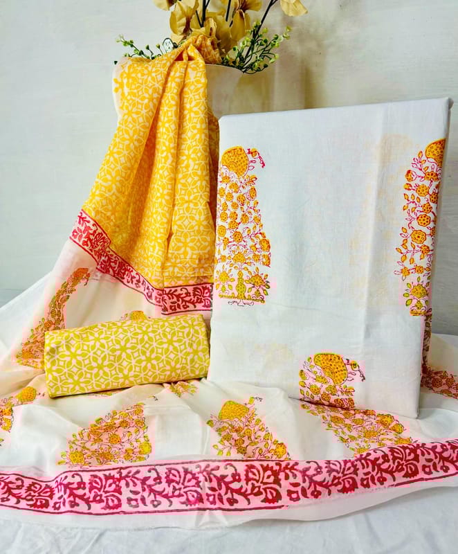 This is an exquisite Cotton Hand Block Printed Unstitched Kurti & Bottom with Mulmul Dupatta. These are beautifully crafted by the skilled women artisans at Alankaran Designs. Cotton fabric will adorn you like breeze of cool air. It is very...