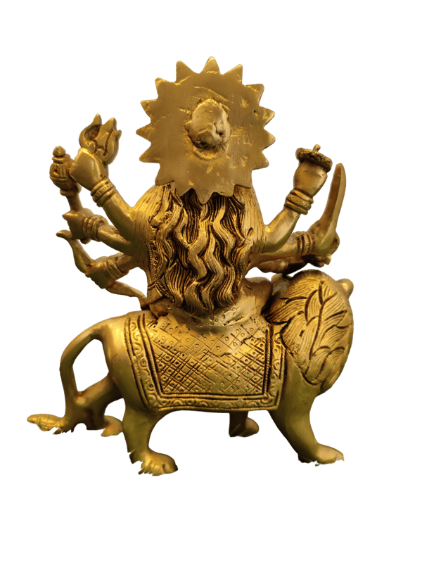 This is a beautiful and intricate statue of the Hindu goddess Durga. She is depicted riding a lion and holding a sword and a trishul. The statue is made of brass and has a golden finish. It is perfect for adding a touch of Hinduism to your home...