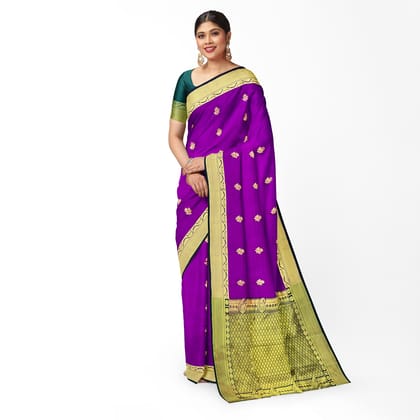 Medium Border with Beautiful Zari Butta Woven Design...Celebrate the essence of our roots with this beautiful saree...Elevate Your Style with our Handpick Collection...Length of saree: 6.4metres(5.5meters saree and 1 meter blouse)