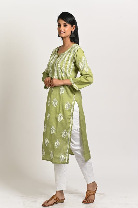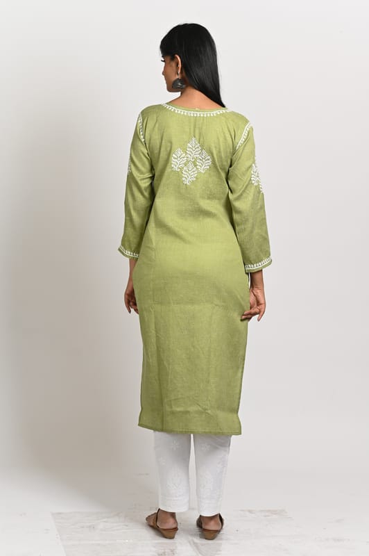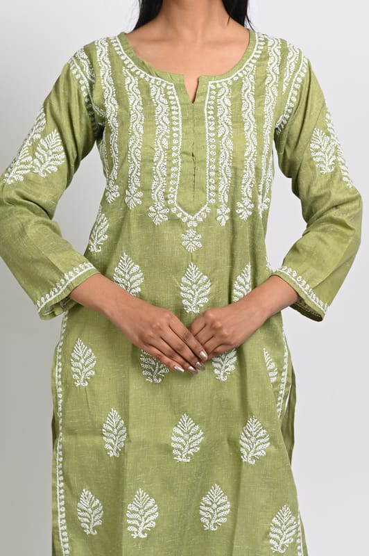 Step into beauty with Inaya Khadi Straight Green Chikankari Kurti. Crafted from luxurious Khadi fabric in cool green colour, this kurti exudes sophistication. Intricate chikankari embroidery adorns the fabric, adding a touch of timeless charm. The straight silhouette offers a flattering fit for all body types, while the soothing color evokes a feeling of calm. Be it a casual day or a special occasion, this kurti effortlessly blends tradition and contemporary style. Elevate your ethnic wardrobe with Inaya Khadi Straight Green Chikankari Kurti, perfect for adding an elegant touch to any ensemble.