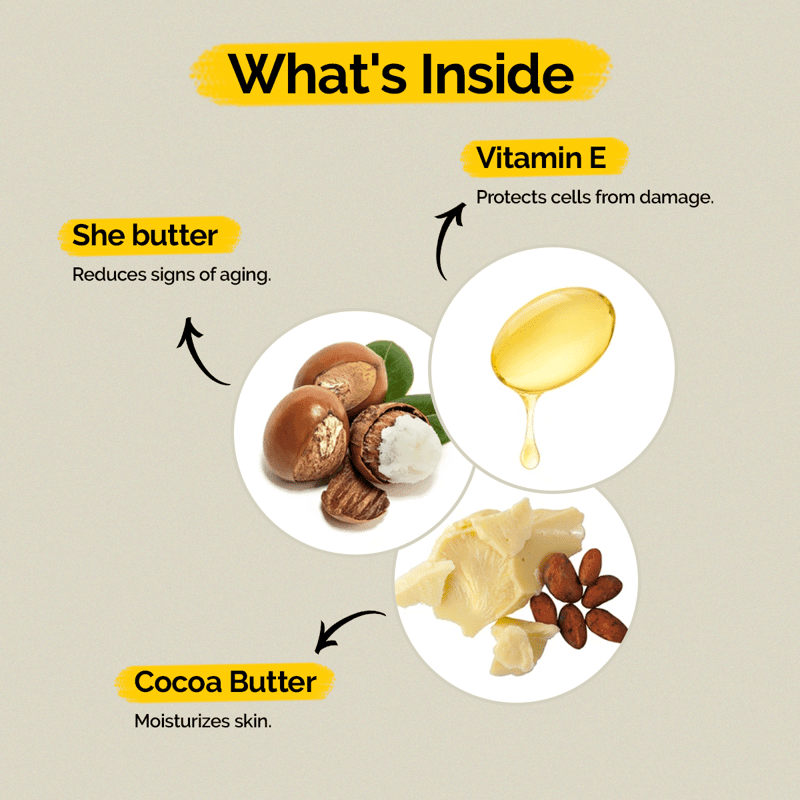 Enriched with shea butter, cocoa butter, and vitamin E. Helps to reduce acne scars as well as fades wrinkles, fine lines, and age spots.