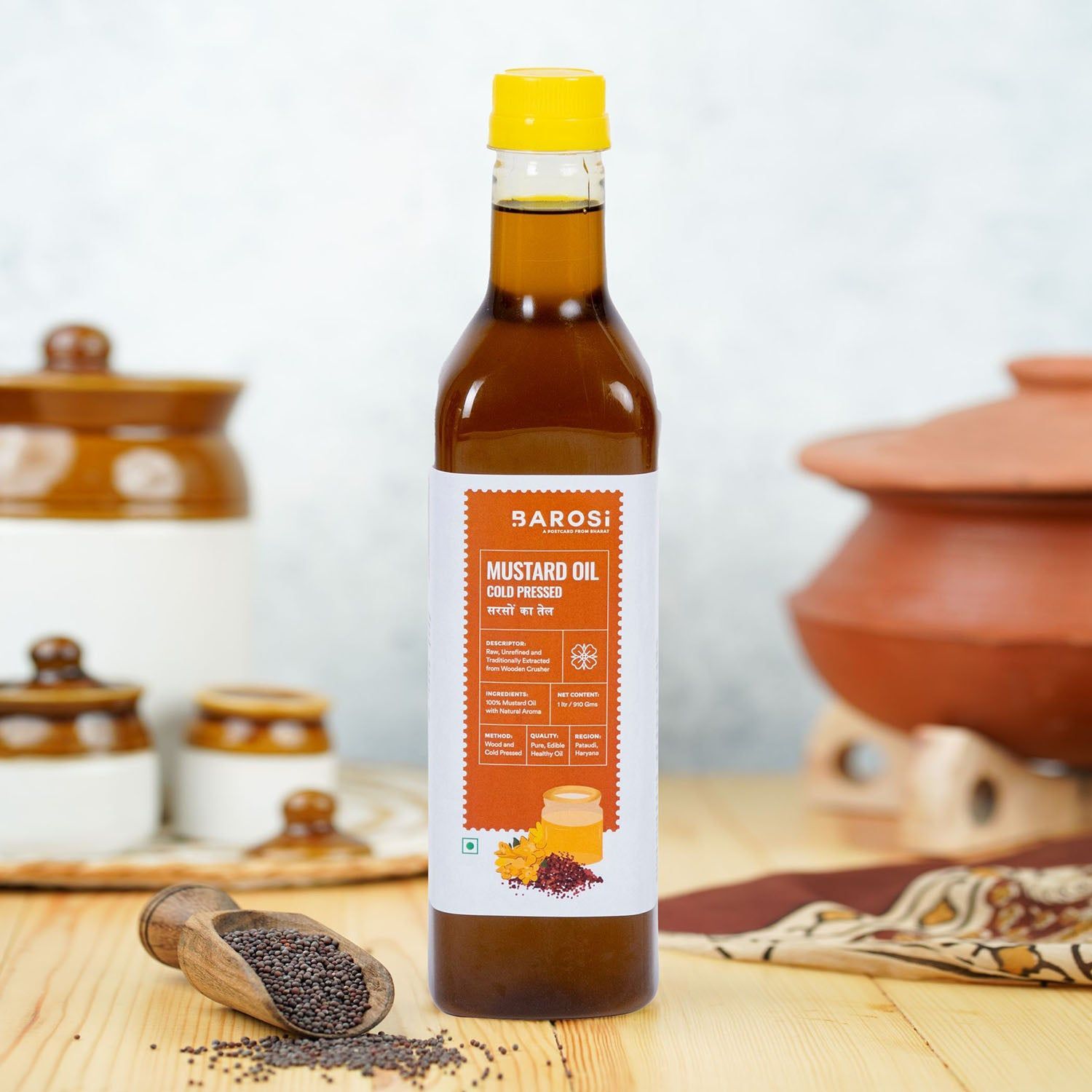 The bright yellow mustard fields sprinkle the air with a sweet fragrance on dewy winter mornings and we wait for some freshly made puris. Our Mustard oil’s journey starts at the lush green fields of Haryana & Rajasthan. We source the seeds from farms and then use wooden churners (kolhu) to extract the oil. It’s the most natural, ancient way of oil extraction, the entire process is completely chemical or preservative free, giving you only the purest & most fragrant mustard oil. And the roughage post extraction becomes a healthy meal for our farm cattle!