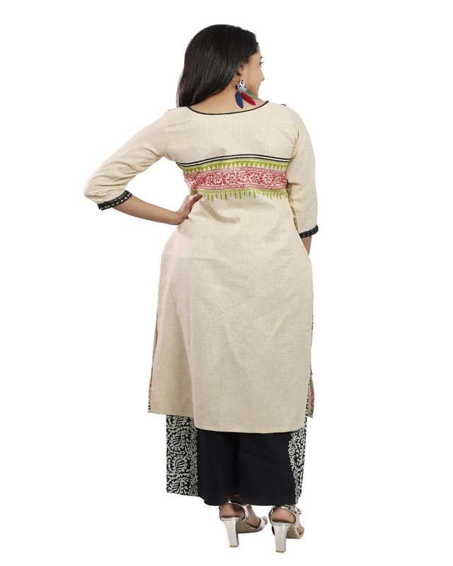 A Classic Expressions By UV cream handloom cotton long kurta features hand prints, shallow boat neck, lace detailings, 3/4 sleeves and straight cut. It is stitched with fine pre-washed cotton lining. Style it with one of our palazzo or pants. This kurta will see you desks to drinks for many days.