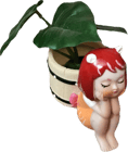 This Figurine is depicted in a sitting position, with her head resting on her hands. Her hair is a vibrant shade of red and her eyes are a deep blue. She is wearing a cute pink and white outfit and has a small flower pot on her head...