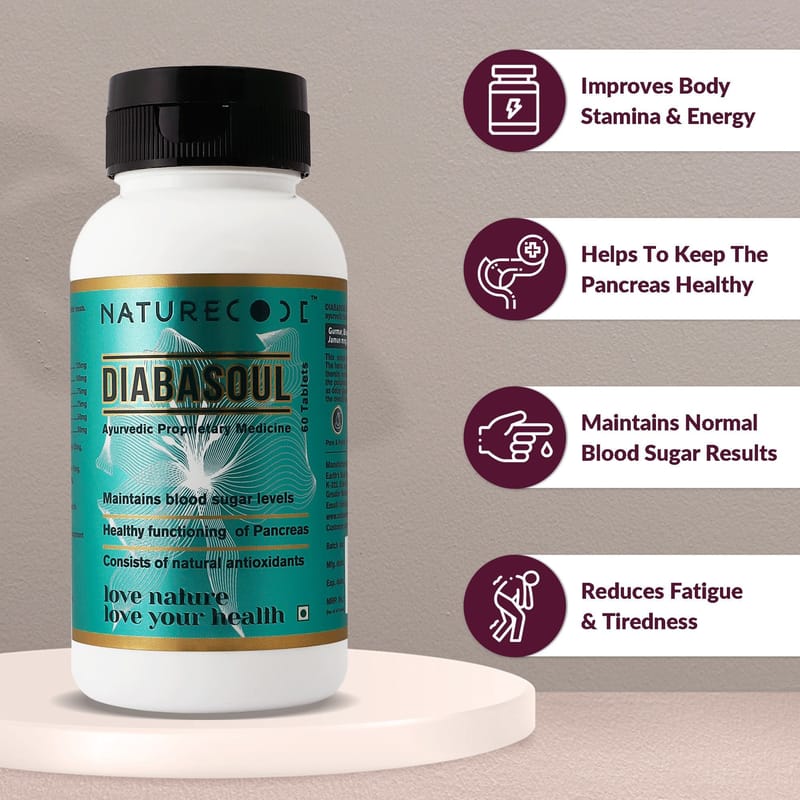 DIABASOUL Tablet is a perfect combination of highly effective ayurvedic herbs and extracts: Gurmar, Bilvapatra, Shilajeet, karela, Methi, Giloya, Jamun Mingi, Neem, Bhumiamla, and Mul...