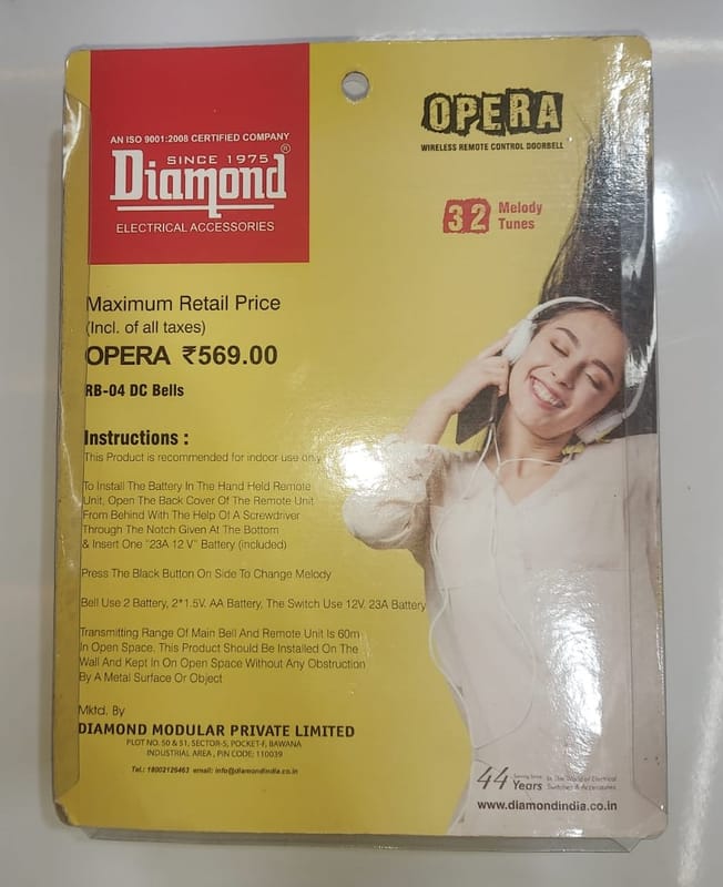 Read MoreThis Remote Bell comes from DIAMOND Company with 6 months warranty on Manufacturing Defects Only. Press the Black button on side to change Melody . Bell uses 2 AA Battery and Remote uses one 12V. 23A Battery.