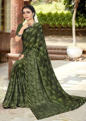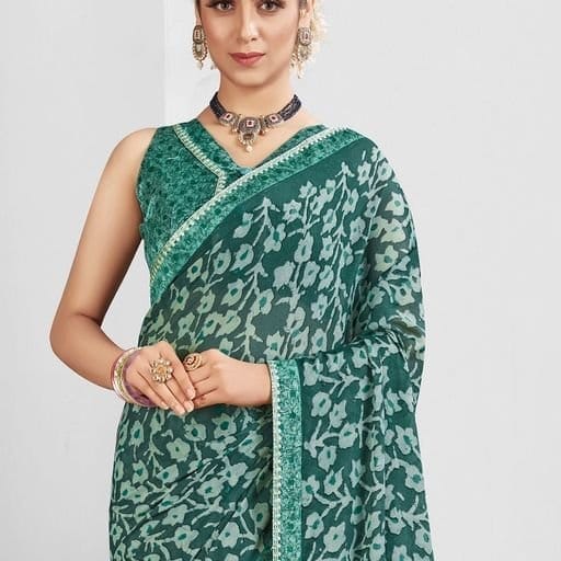 Faux Georgette Saree in Green with Digital, Floral Print and Patch Border Work
