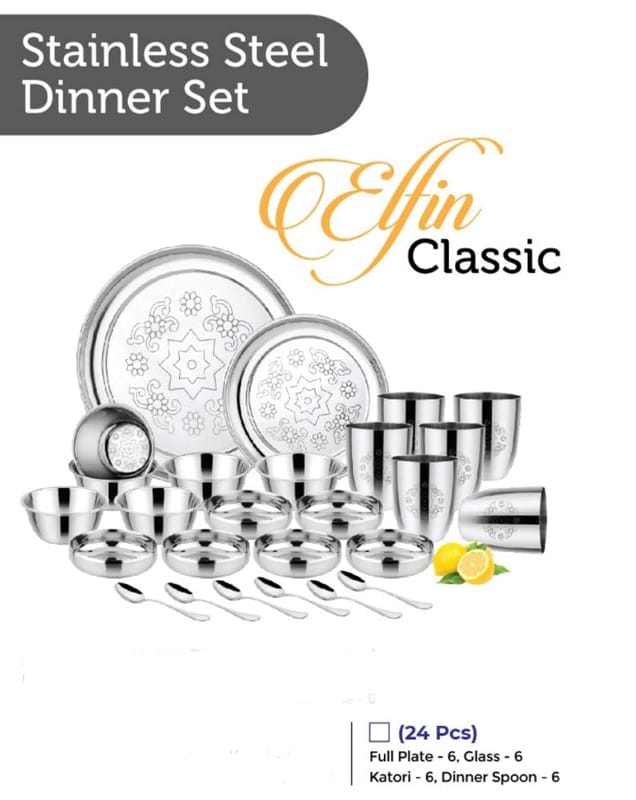 Read MoreELFIN CLASSIC DINNER SET PACKAGE CONTENT: Dinner Plates, Side Plates, Glasses, Bowls, Halwa Katori, Dessert Spoons, Dessert Fork.