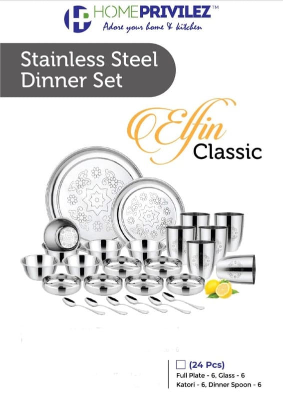 Read MoreELFIN CLASSIC DINNER SET PACKAGE CONTENT: Dinner Plates, Side Plates, Glasses, Bowls, Halwa Katori, Dessert Spoons, Dessert Fork.