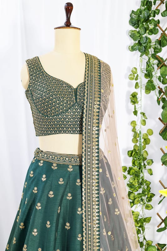 Introducing the Enchanting Emerald: Kkashi Green Lehenga, a mesmerizing blend of traditional elegance and contemporary allure. This exquisite piece of craftsmanship is designed to make a statement and leave a lasting impression on any occasion.