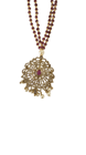 This stunning necklace set is perfect for any special occasion. The intricate gold work and shimmering maroon beads are sure to turn heads. The set includes a necklace and a pair of earrings, making it the perfect accessory for a bride or bride...