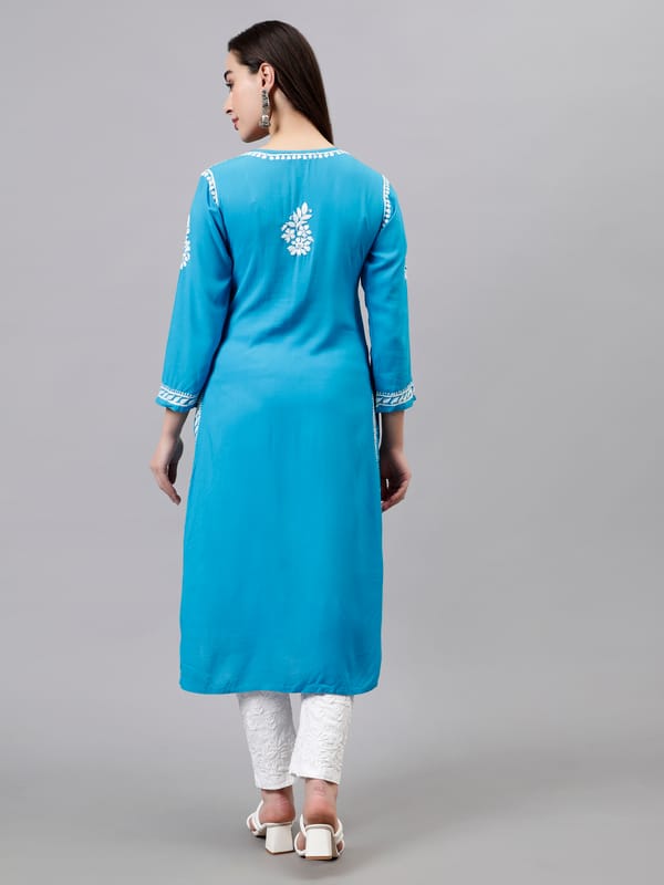 ...Read MoreSeva Chikan Ghas Patti Chikankari Firozi Blue Rayon Kurta