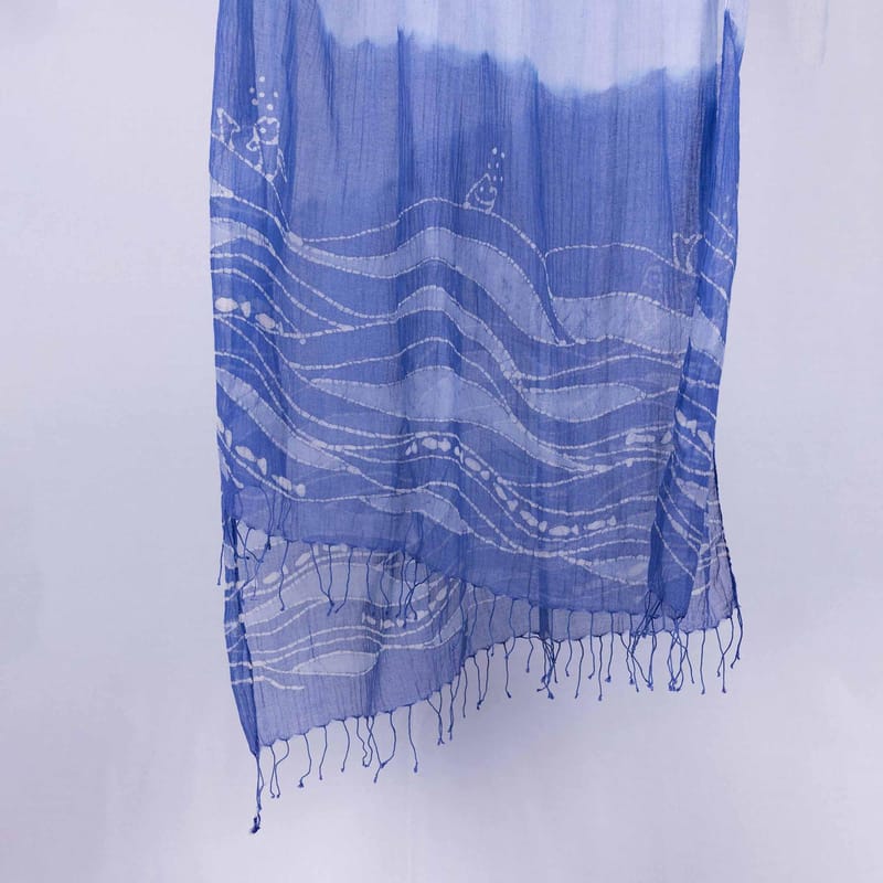 A playful dip-dyed scarf with Fish and waves motifs artfully carved out in batik technique in our favorite blue. Batik is a wax resist technique where the patterns are resisted with wax and then dyed, resulting in light-colored patterns against a dark background. This scarf is made by a batik artisan in Ahmedabad who has been practicing this art for many generations.
