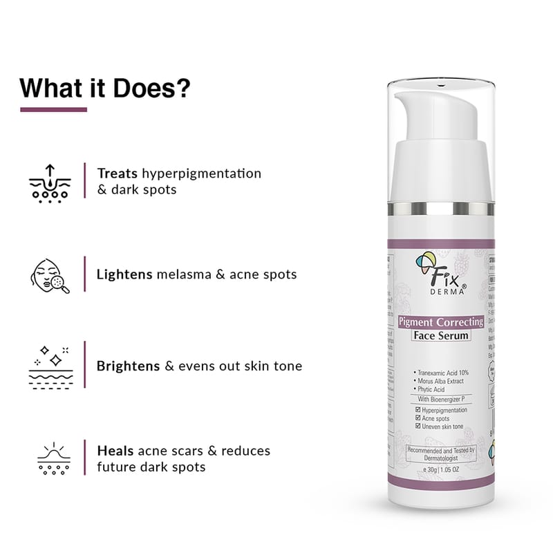 What is it? Fixderma Pigment corrector serum is a powerful formulation that helps visibly correct the appearance of dark spots and uneven skin tone. Formulated with an overpowering combination of Tranexamic Acid, Phytic Acid, Morus Alba Extract, and Bioenergizer P, the serum reduces discoloration and acne scars, while reducing future dark spots to brighten the skin complexion.