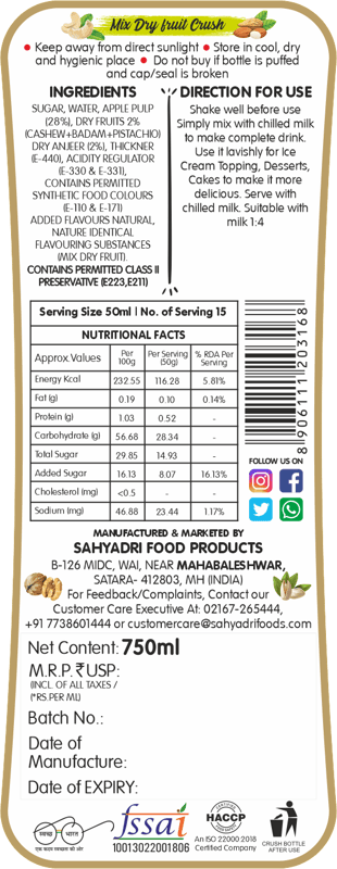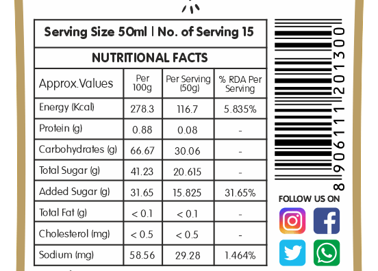 | Instructions | Shake well before use. Simple Mix with Chilled Water or Milk to make a complete Drink. Use it Lavishly for Ice Creams, Desserts , Cakes to make it more Delicious. Great for Making Cocktail , Mocktail , Slush. Serve with Chilled Water / Milk. Suitable with Water (1:4) / Milk (1:5) |