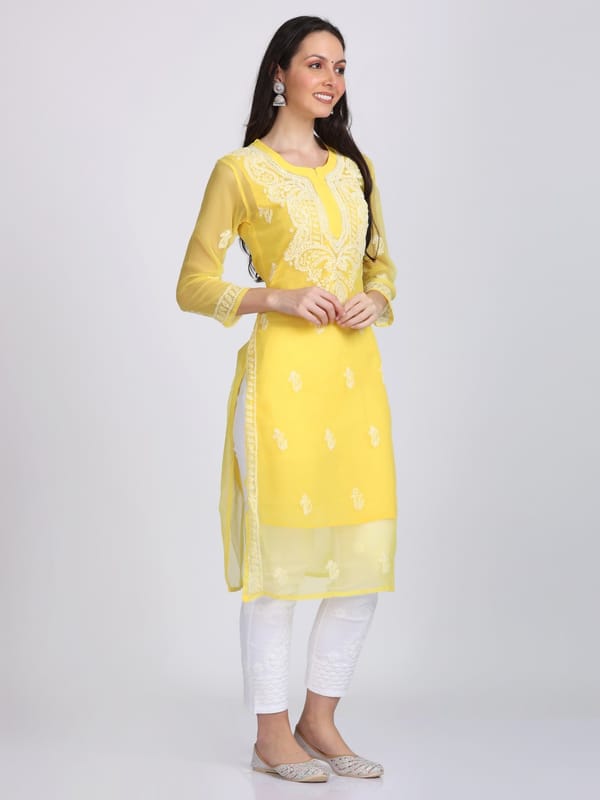 Chikankari Kurti Qawee Kurti Handmade Chikankari work Fabric: Georgette Colour: Yellow Embroidery Colour: White Length: 44 (approx)'' Neck: Round Neck Sleeves: Quarter Sleeves (3/4)