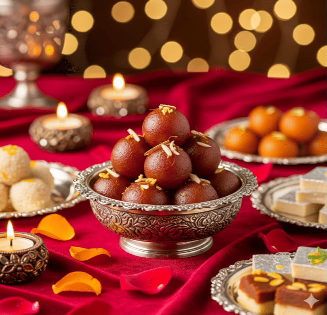 Gulab jamun is soft delicious berry-sized balls made with milk solids, flour & a leavening agent. These are soaked in rose-flavored sugar syrup & enjoyed. The word “gulab” translates to rose in Hindi & “jamun” to berry.