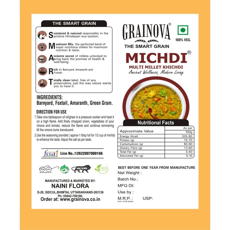 Grainova Michdi takes our beloved khichdi to the next level. Carefully crafted blend of millets and lentils, with added fibre and protein takes our Michdi a notch above the average khichdiOur grains are grown without the use of any pesticides or fertilizers ensuring we bring the best nature has to offer right to your plate. Grainova Multi Millet Khichdi is the source of protein.Michdi is 100% gluten free and soy free. It is free from any added preservatives or sulfites as well.