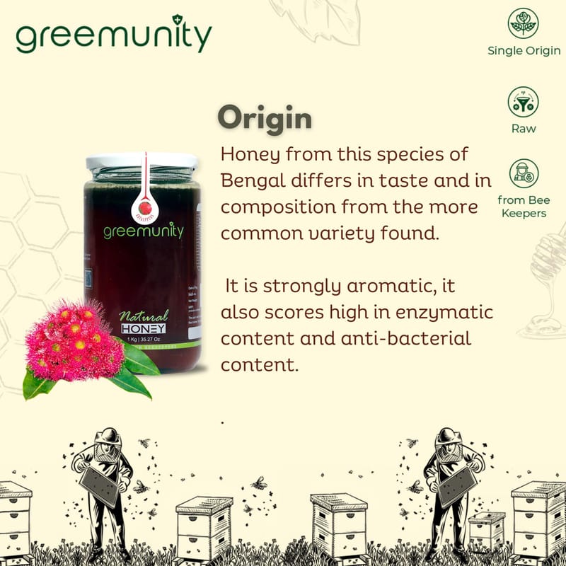 SOURCE: Sourced directly from beekeepers, Honey from this species of Bengal differs in taste and in composition from the more common variety found. It is strongly aromatic, it also scores high in enzymatic content and anti-bacterial content.