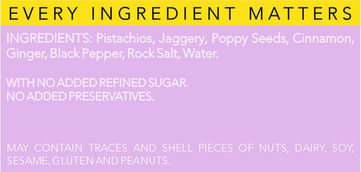 We Indians have grown up absolutely loving Chikki (and of course the memories). While the authentic homemade Chikkis originally only had purely the nut and jaggery as key ingredients, on its way to becoming an accessible snack, it went through a whole lot of unnecessary alterations viz. glucose syrups, preservatives, bad oils, etc. We decided to bring back the original for you while also adding a much needed boost to it : we used pistachios along with a wholesome addition of poppy seeds and Indian spices viz. cinnamon, ginger, and black pepper. We also deconstructed it to handle portion size better – so every single nut is individually coated.