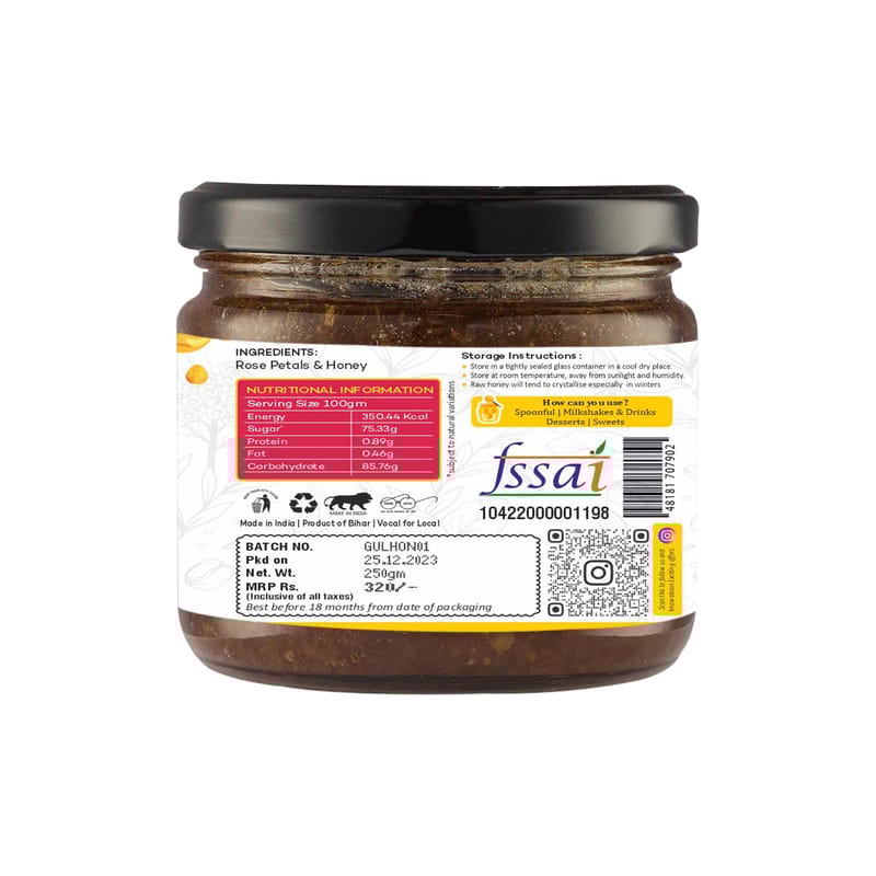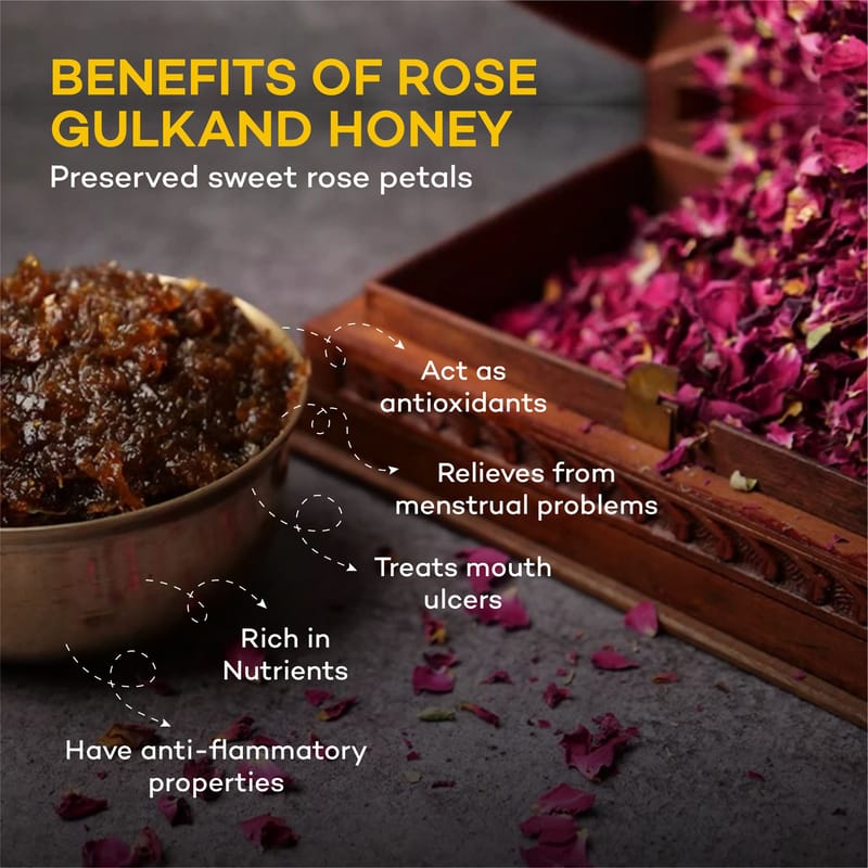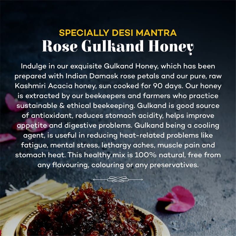 Indulge in our exquisite Gulkand Honey, which has been prepared with Indian Damask rose petals and our pure, raw Kashmiri Acacia honey, sun cooked for 90 days. Our honey is extracted by our beekeepers and farmers who practice sustainable & ethical beekeeping. Gulkand is good source of antioxidant, reduces stomach acidity, helps improve appetite and digestive problems. Gulkand being a cooling agent, is useful in reducing heat-related problems like fatigue, mental stress, lethargy aches, muscle pain and stomach heat. This healthy mix is 100% natural, free from any flavouring, colouring or any preservatives.