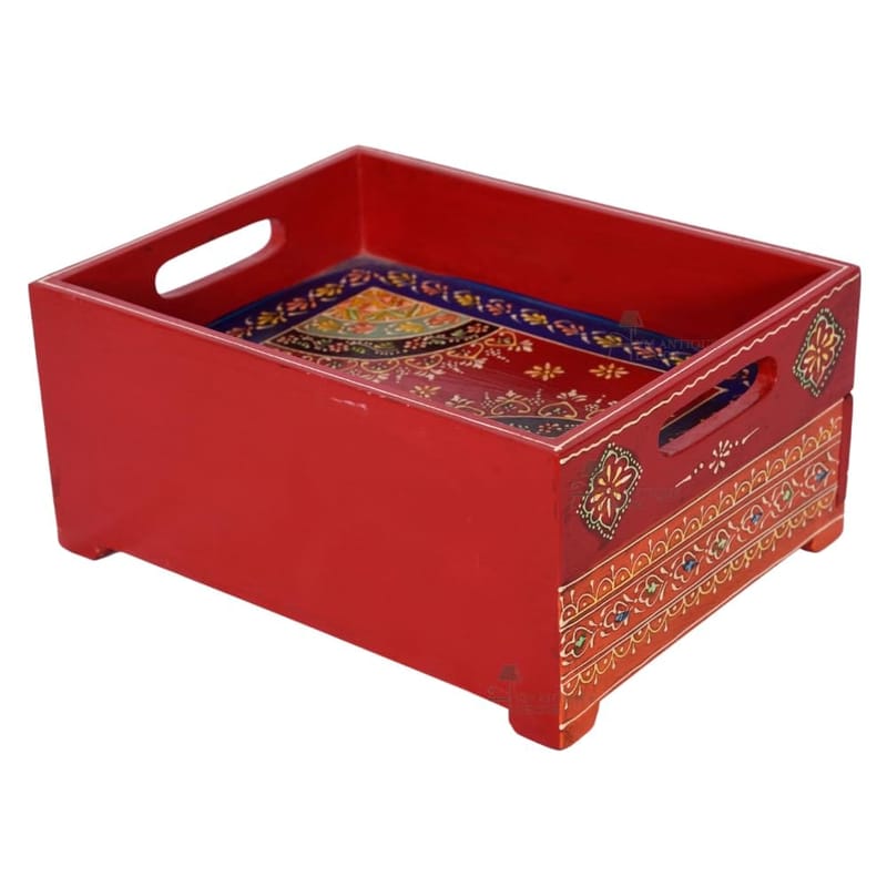 "Immerse your home in the vibrant colors of traditional Rajasthani art with this exquisite hand-painted wooden storage tray. Measuring 30cm in depth, 14cm in width, and 23cm in height, this tray features a meticulously crafted drawer for added ...