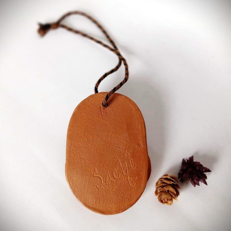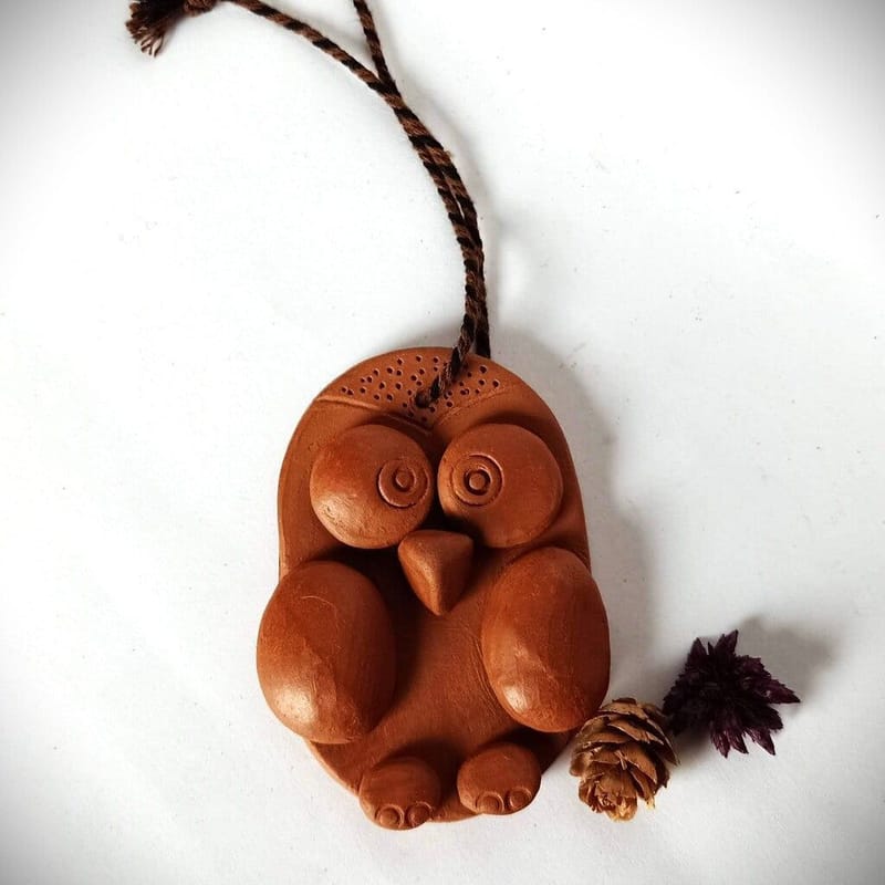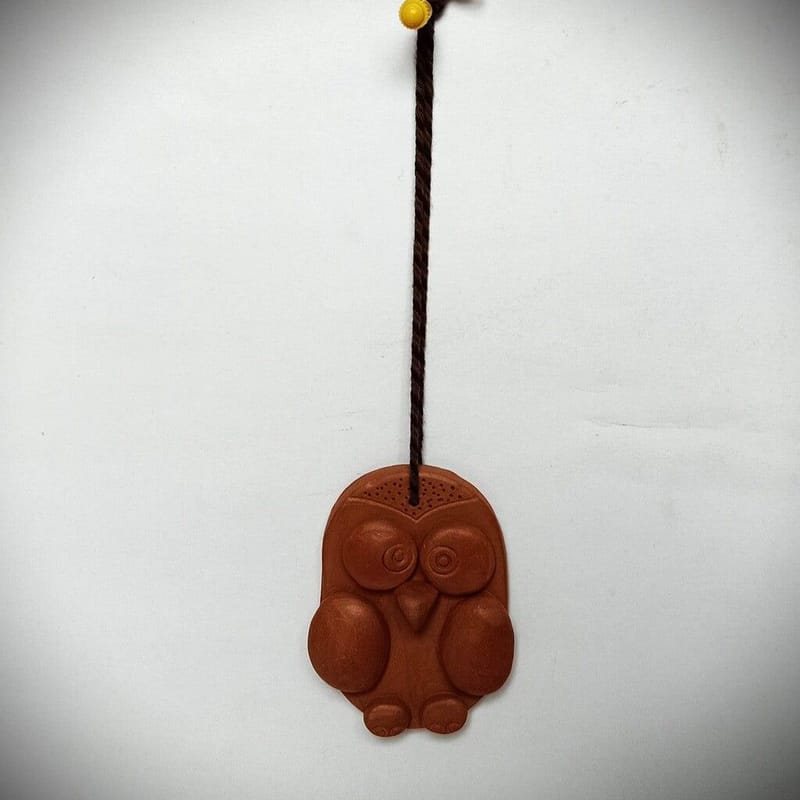 Handcrafted terracotta hanging charm cum diffuser inspired from the wise owl! Can be used as wall-accent, comes with a provision for hanging. With a few drops of your favorite essential oil on its back, it'll also keep diffusing a pleasant fragrance! You could also hang this in your closet/car or anywhere you please. The product features slab-built relief-work terracotta pottery. What you bring home is a unique piece of terracotta craft!