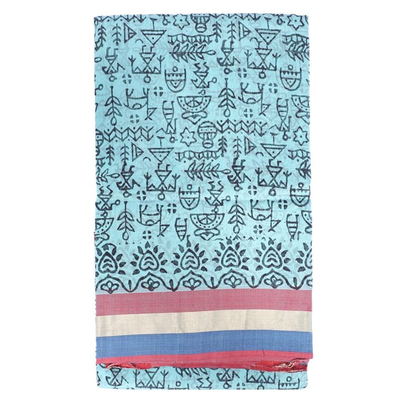 HANDLOOM CHANDERI PRINTED(SILK + COTTON)SAREE WITH BLOUSE, GHEECHA PALLU, ZARI BORDER WARLI PRINT