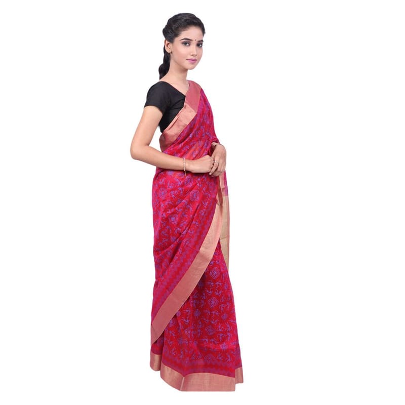 HANDLOOM CHANDERI PRINTED(SILK + COTTON)SAREE WITH BLOUSE, TISSU PALLU, ZARI BORDER WARLI PRINT