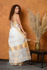 This saree is made from a blend of pure cotton and linen fibers, offering a balance of softness, breathability, and durability. Cotton lends a smooth texture and ease of wear, while linen adds a subtle sheen, texture, and a slightly crisp feel to the fabric.The saree features a golden border that adds a touch of glamour and elegance. The golden border contrasts beautifully with the earthy tones of cotton and linen, creating a harmonious and sophisticated look.