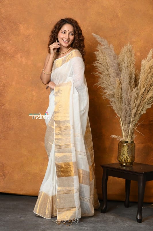 Design:Handloom pure cotton linen sarees are available in a range of colors, including natural hues with the golden border complementing these colors and adding a festive or formal touch to the saree.
