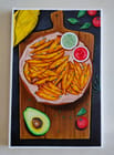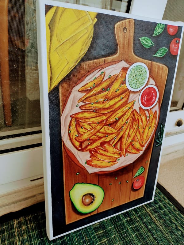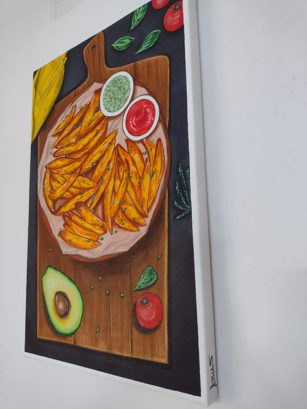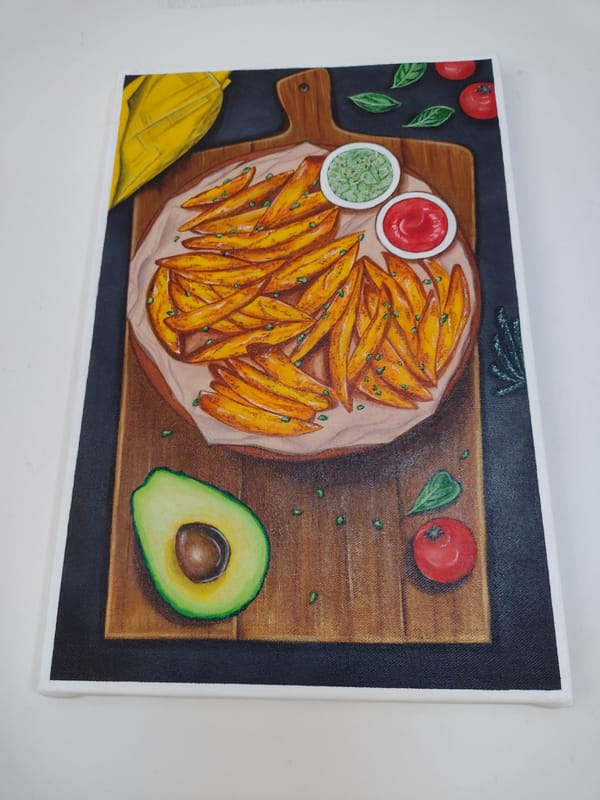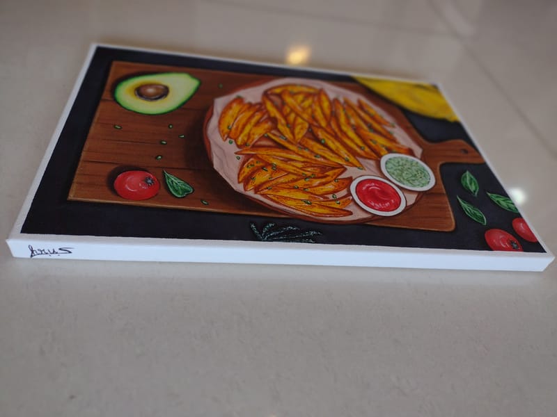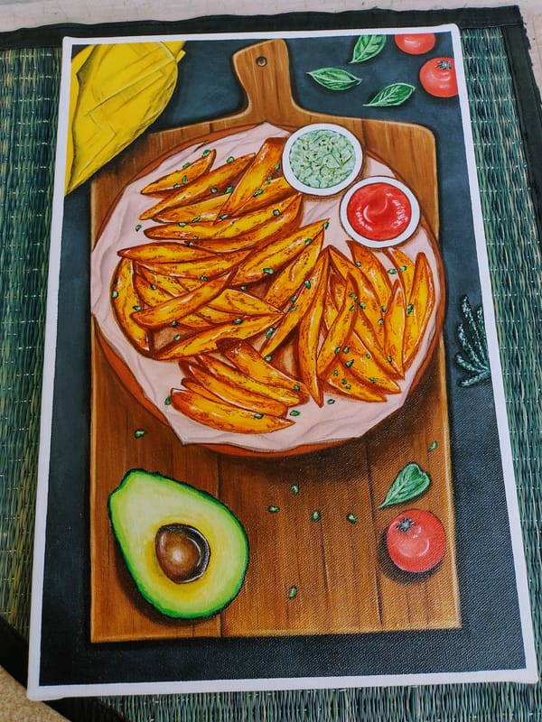 A realistic looking Still Life Painting of "Crispy Fries served with Guacamole and Tomato Ketchup on a Wooden Platter" with elaborate details of how it is typically served in a fine dining restuarant.
