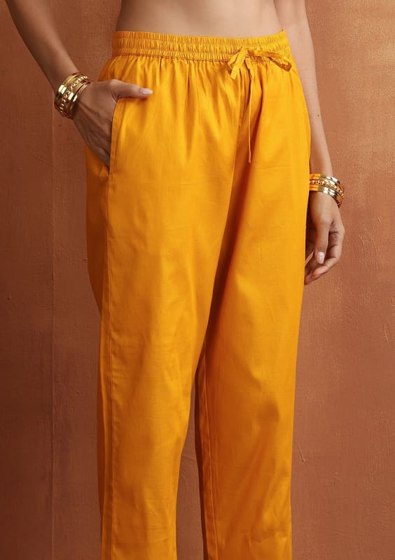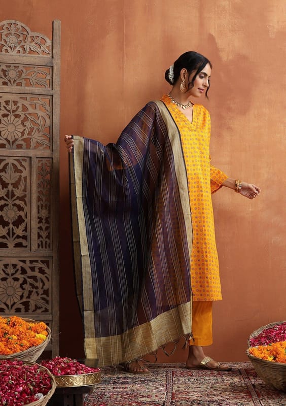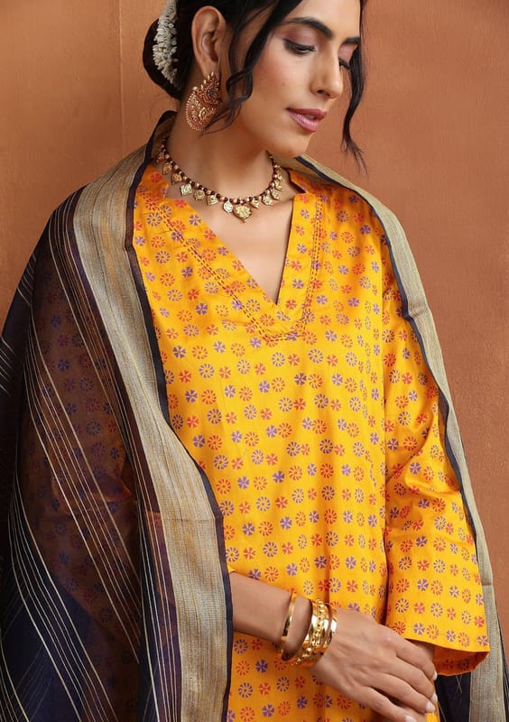 Luxurious and exclusive, indulge in our Glazed Cotton Hand Block Printed Women's 3 PC Long Kurta Set with Hand Embroidery and Dupatta in a rich mustard color.