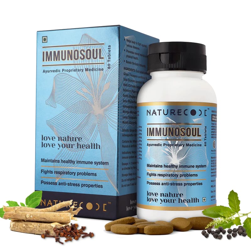IMMUNOSOUL is a rare combination of natural herbs: Giloya, Tulsi, Haldi, , Kalimirch, Sunthi, Amla , Ashwagandha, Moringa, Loung, and Mulethi. These herbs are known for their str...