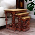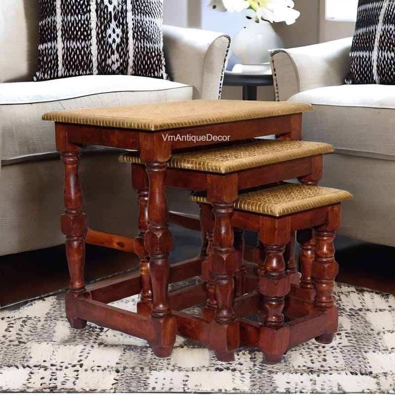 This wooden nesting table is Made by skilled craftsmen of India. Handmade item. It was crafted from Mango wood of India and made by the artisan to make it the natural color, later the metal brass fitting was done by the hands of the Artisan. In...