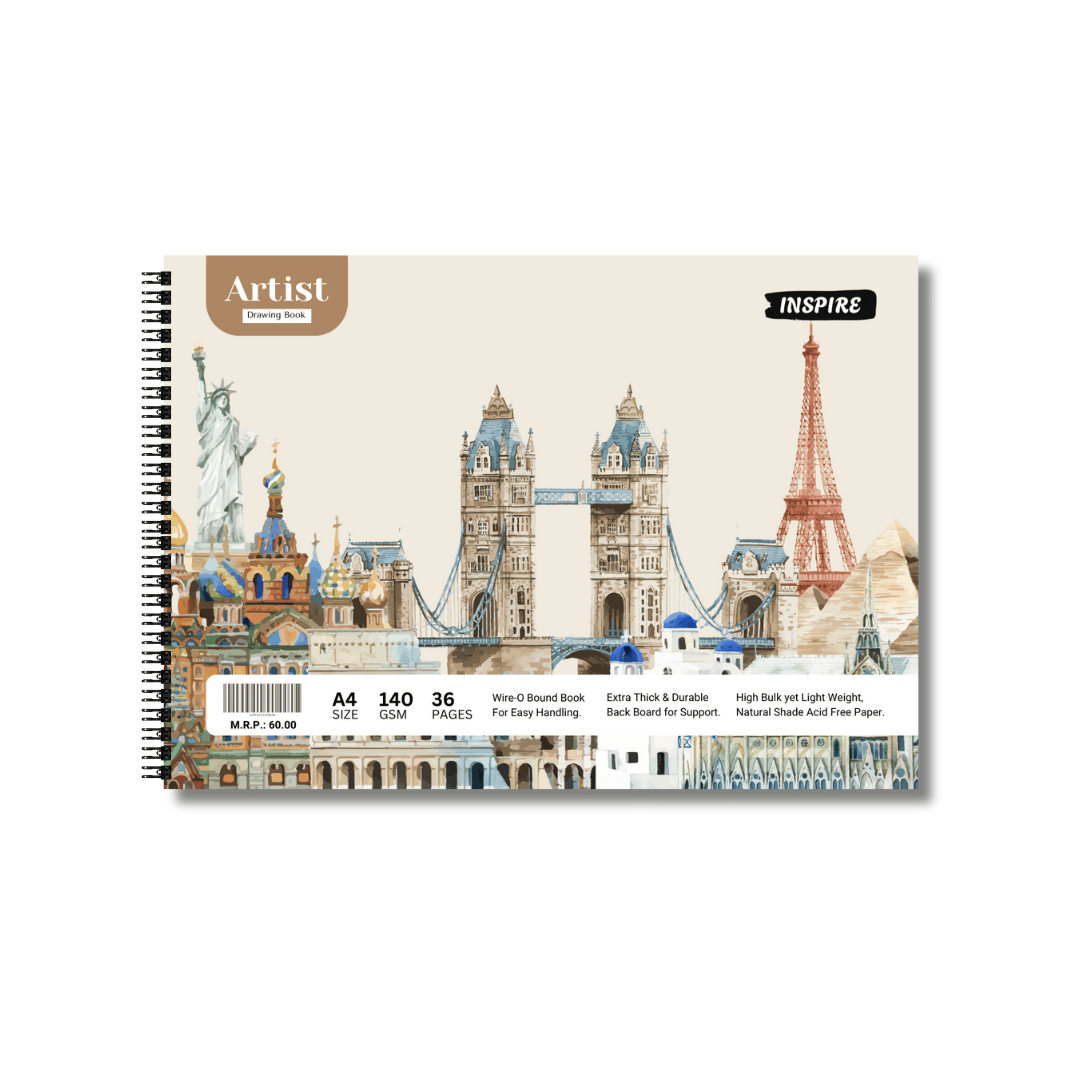 It introduces the INSPIRE A4 Sketch Book: 36 pages of premium 140 GSM paper in a generous 29.7 cm x 21 cm size. Perfect for artists of all levels, it offers a durable, acid-free canvas for sketches, doodles, and more. Versatile and compact, this pack of 1 sketchbook is your go-to for artistic inspiration, anytime, anywhere.