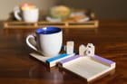 WOODEN COASTERS WITH CAMERA MINIATURE - A set of two bright and colourful wooden coasters with a hand crafted wooden camera miniature.