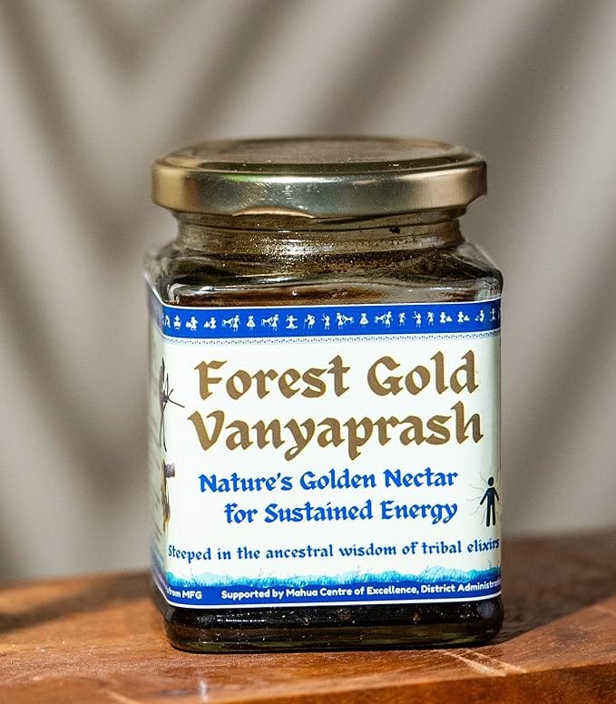 Nature's Golden Nectar: Discover the essence of pure ingredients in Forest Gold Vanyaprash, crafted from handpicked Mahua flowers from the pristine forests of Chhattisgarh.